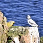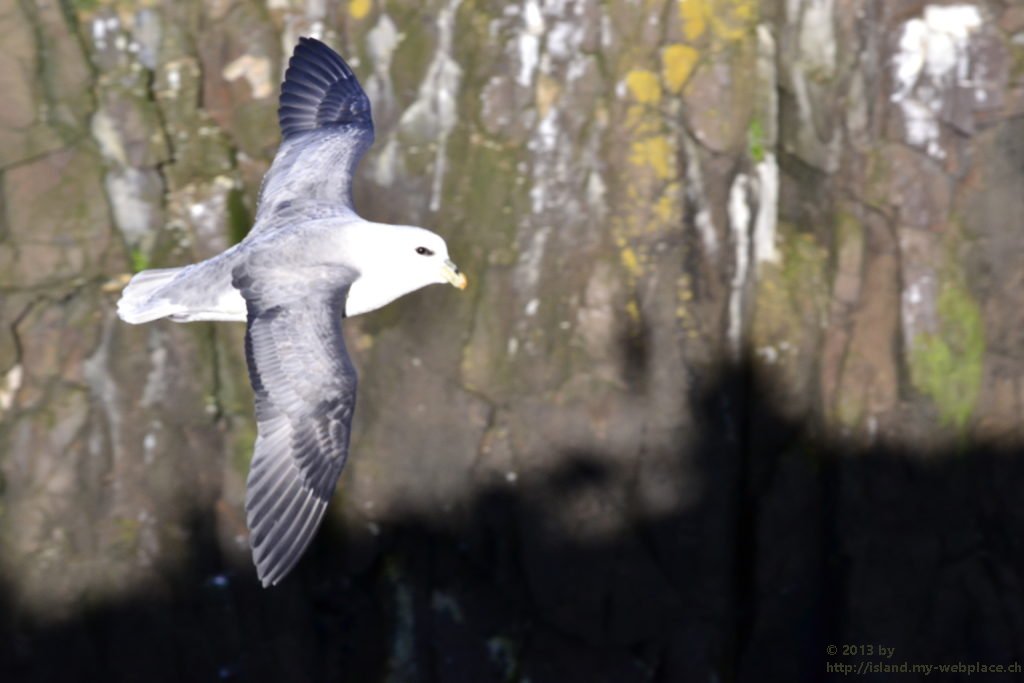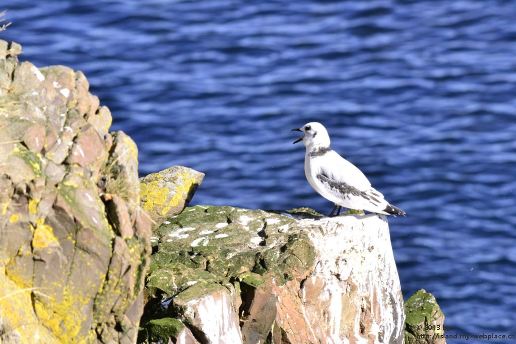 5km weiter den Klippen entlang gelangen wir zu einem kleinen Fischerhafen, der für sich alleine schon sehenswert ist. Die Mehrheit der Touristen sucht aber diesen Ort auf, weil am dortigen Felsen alle Jahre unzählige verschiedene Vogelarten nisten. Wir hoffen natürlich, dass wir hier noch den einen oder anderen Papageientaucher antreffen. Ein Schild sagt uns dann, dass diese spezielle Vogelart von Mitte Juni bis 15. August dort verbringt und danach weiter zieht. Es scheint als hätten die Puffins, wie man sie auf englisch nennt, tatsächlich einen inneren Kalender. Vor Ort nisten nur noch die heimischen Möven und Eisvögel. Ein verirrter Puffin schwirrt noch durch die Lüfte, aber auch nur so weit entfernt, dass wir ihn kaum erkennen.