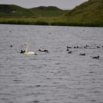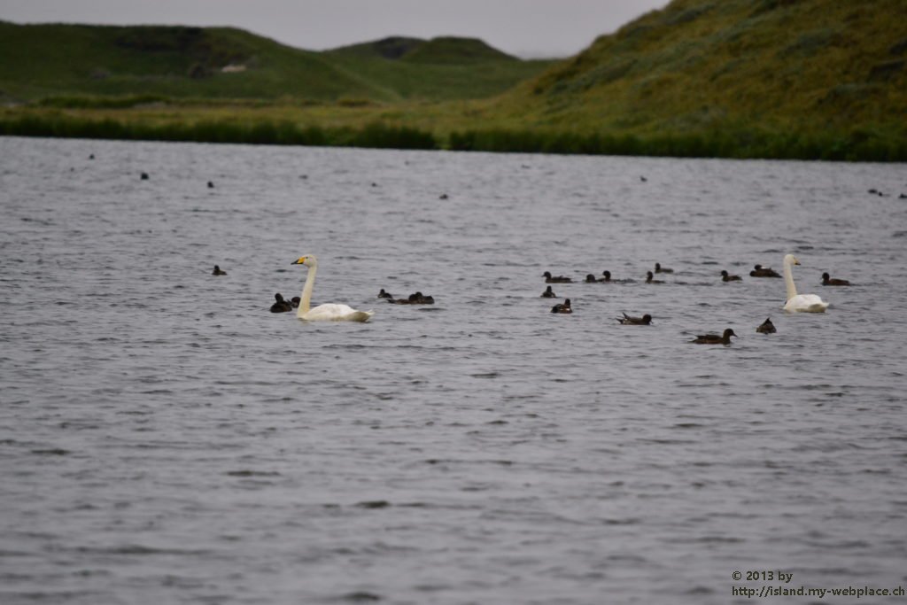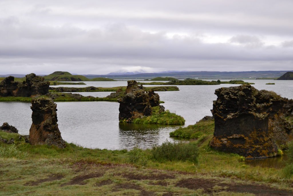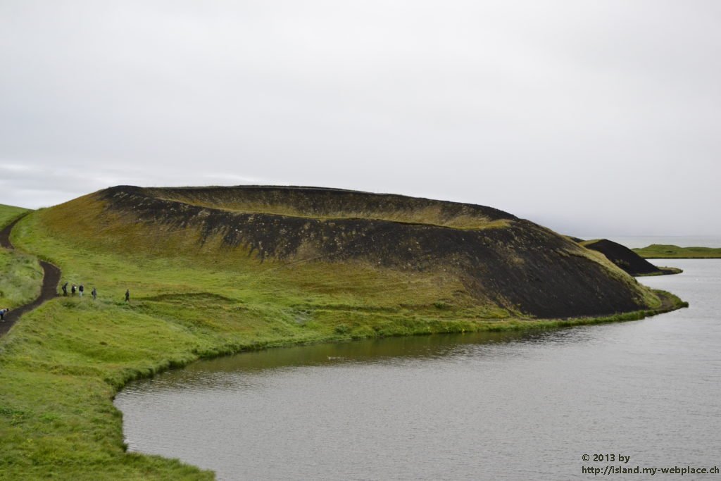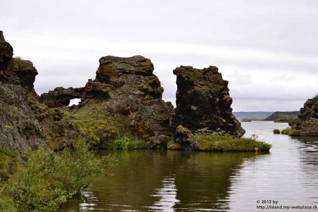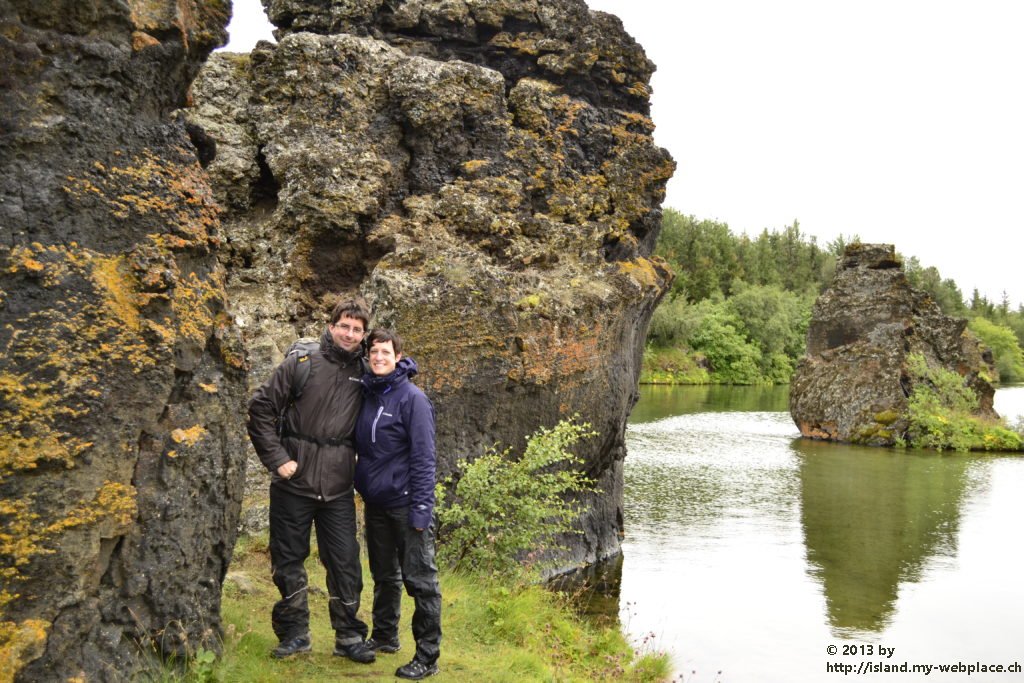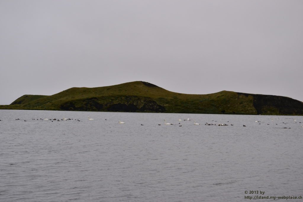 Als erstes fahren wir eine kleine Halbinsel namens Skutustadagigar an. Auf diesem natürlichen Monument finden wir einige Pseudokrater vor, um welche sich die heimische Vogelwelt tummelt. Wenn brennende Lava und kaltes Gewässer, wie dieser See hier zusammentreffen, gibt es Dampfexplosionen, die dann solche Gebilde wie diese Pseudokrater entstehen lässt. Da aus diesen Kratern auch keine Lava selbst kommen kann, nennt man sie Pseudokrater.