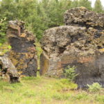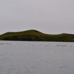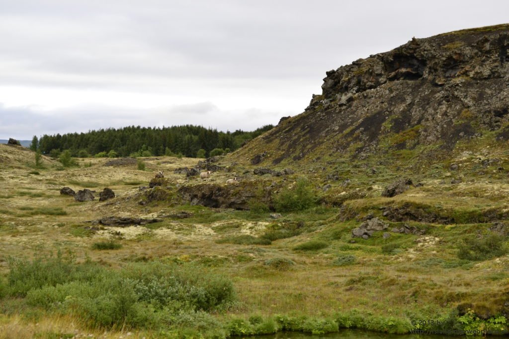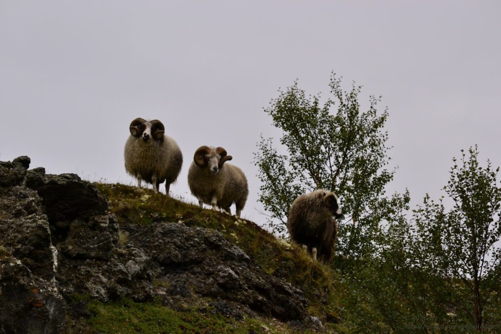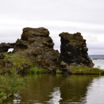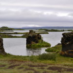 Der nächste Stopp ist am Kalfaströnd. Wieder eine Art Halbinsel, in welcher sich auch der Nationalpark Höfdi befindet, der mit Nadelbäumen aufgeforstet wurde. Wir spazieren auf der Insel bis nach vorne an die Spitze. Unterwegs springen uns ein paar Schafe über den Weg davon. Aber so neugierig wie die Fellknäuel sind, rennen sie nur bis oben auf den Hügel und beobachten dann ganz genau wo wir weiter lang gehen. An der vordersten Spitze öffnet sich uns ein besonderes Naturschauspiel. Skulpturenähnliche Lavaformationen stehen hier im Myvatn-See und scheinen die Region vor Bösem zu bewahren.