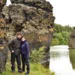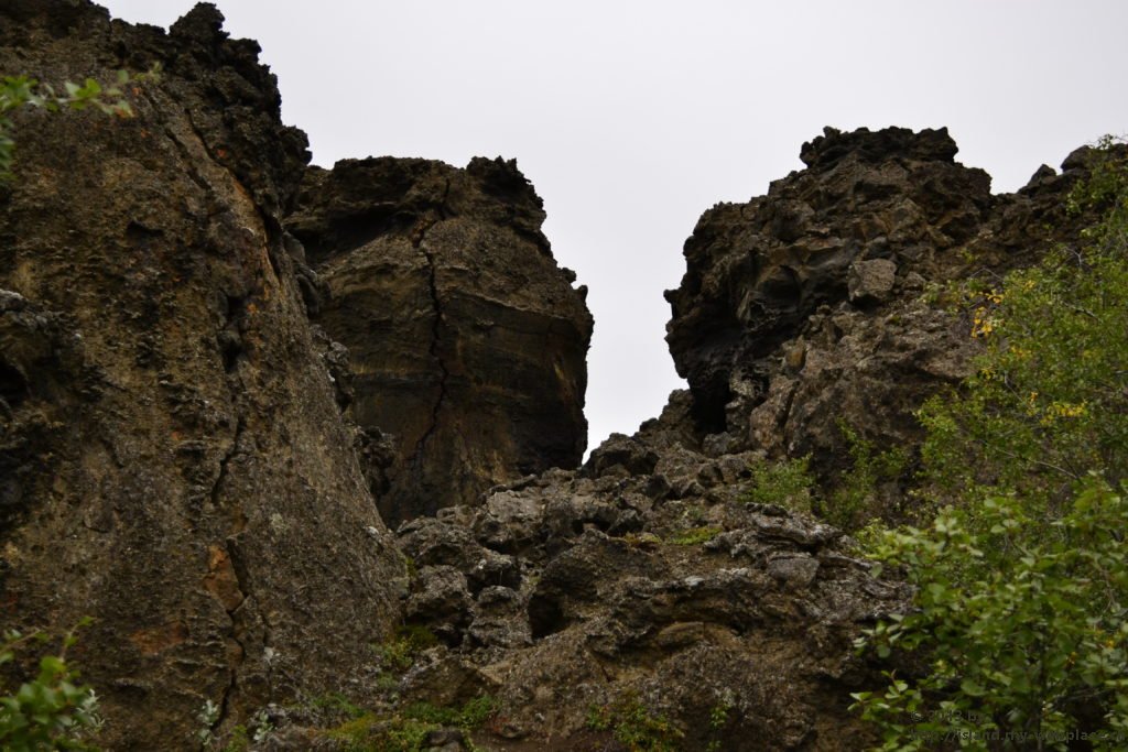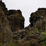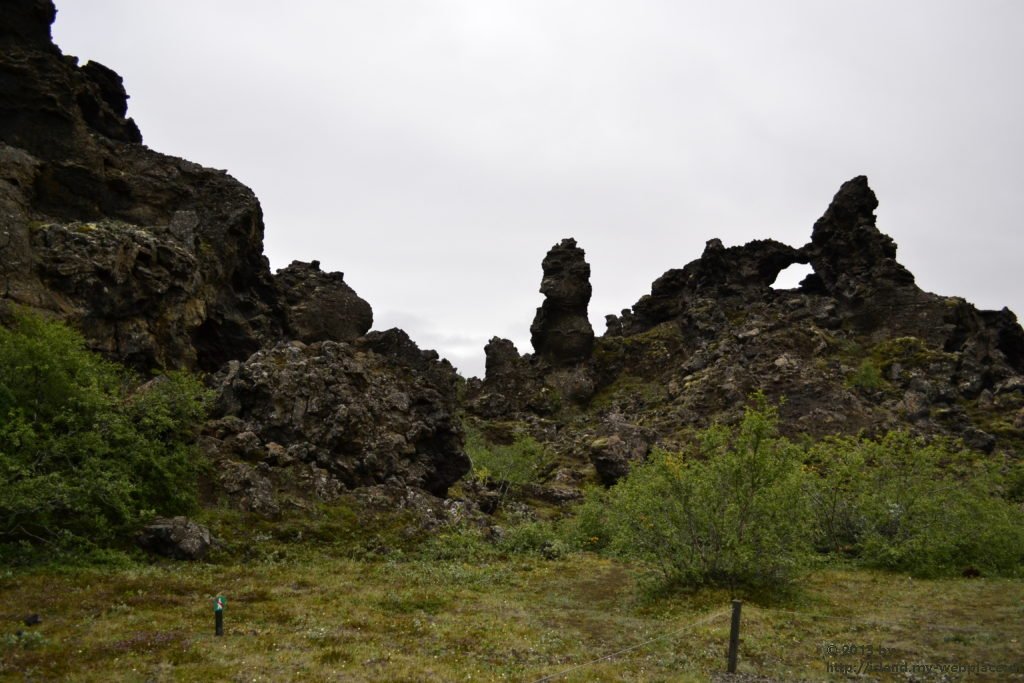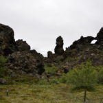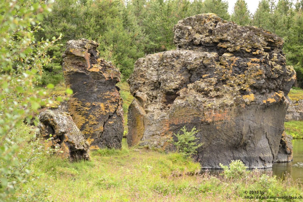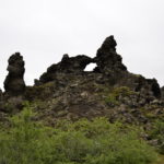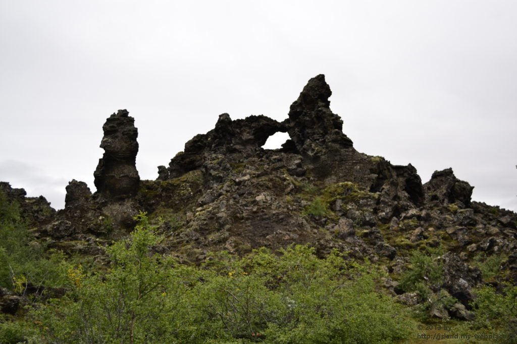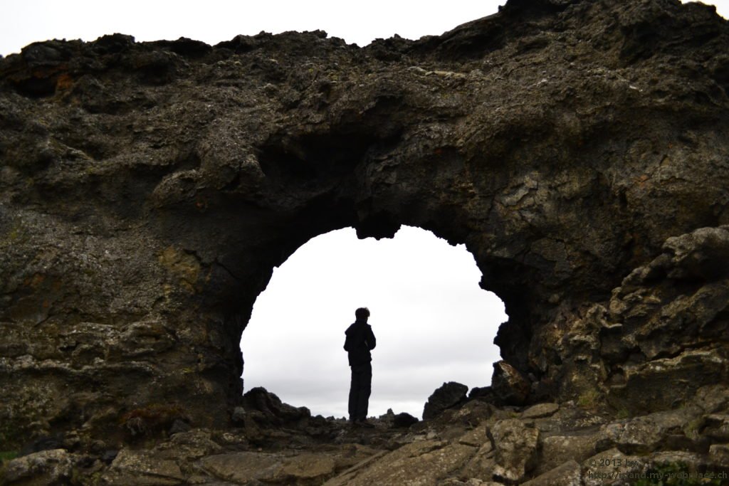 Vom Rundgang in der grünen Natur geht es dann weiter ins die schwarze Region nach Dimmuborgir, zu den dunklen Burgen. Dieses Gebiet hier besteht praktisch nur aus Lavaformationen, die sich vor über 2000 Jahren hier nach einem Vulkanausbruch gebildet haben. In dieser eigenartigen Landschaft sollen der Sage nach die Trolle hausen. Wenn man die zum Teil 40m hohen Felsen anschaut, kann man mit etwas Fantasie die eine oder andere Skulptur entdecken.