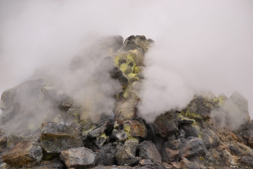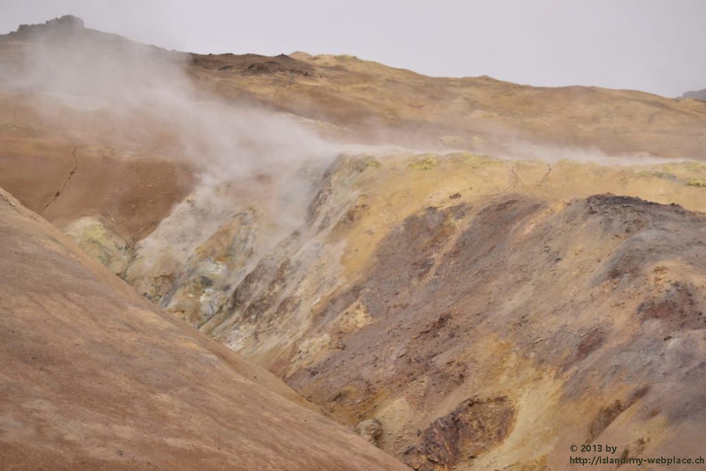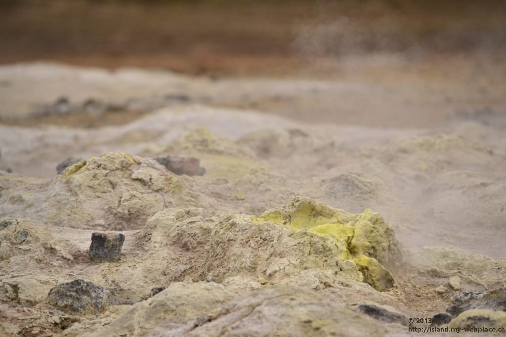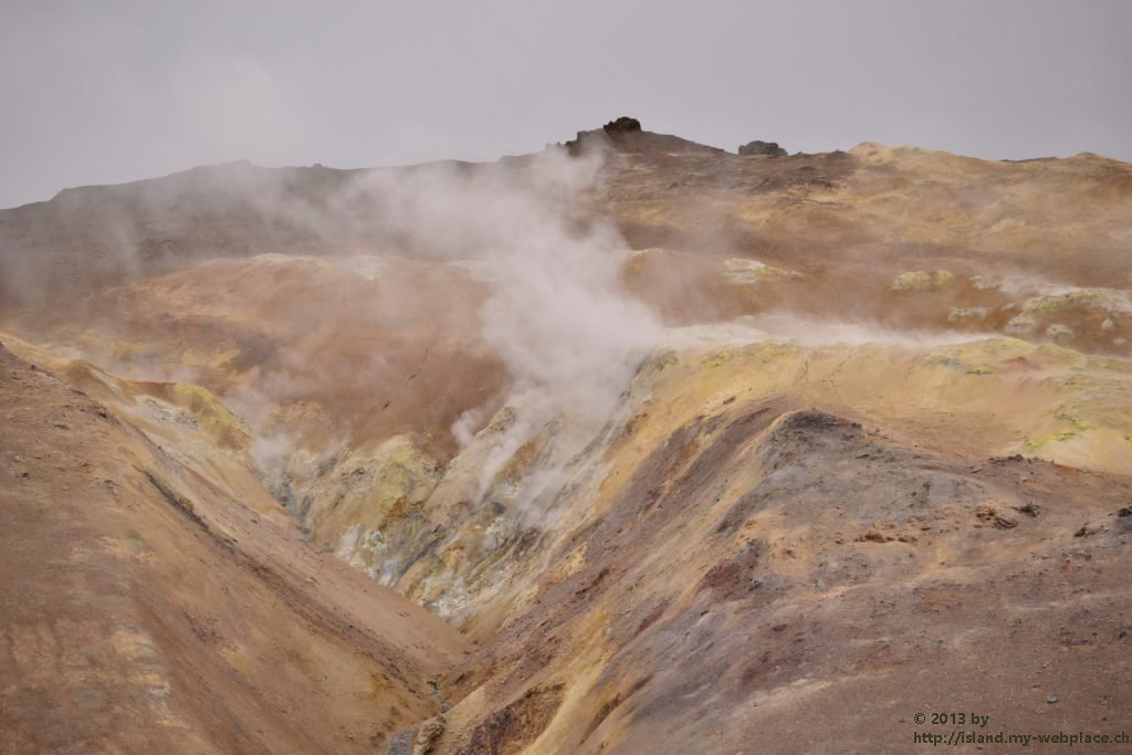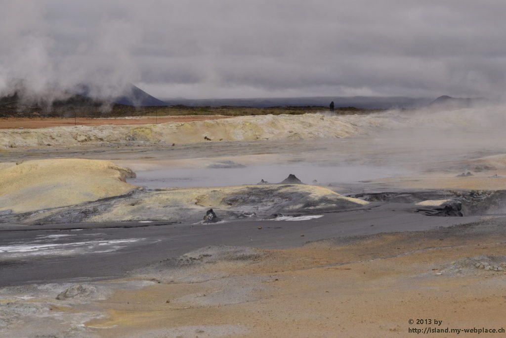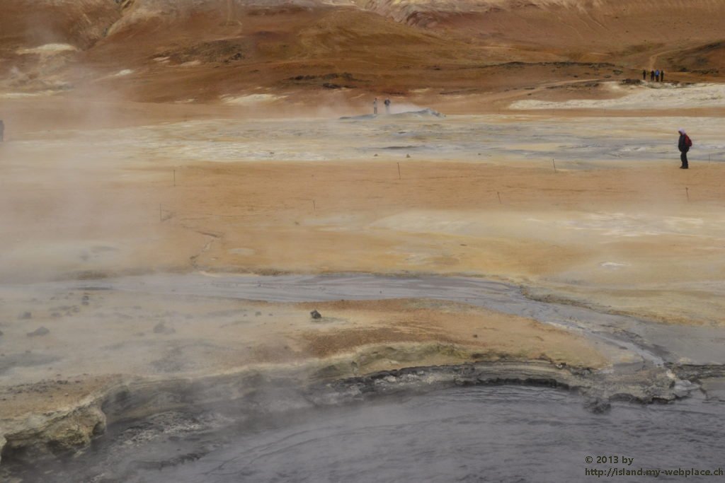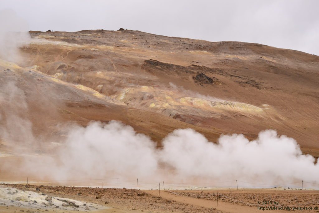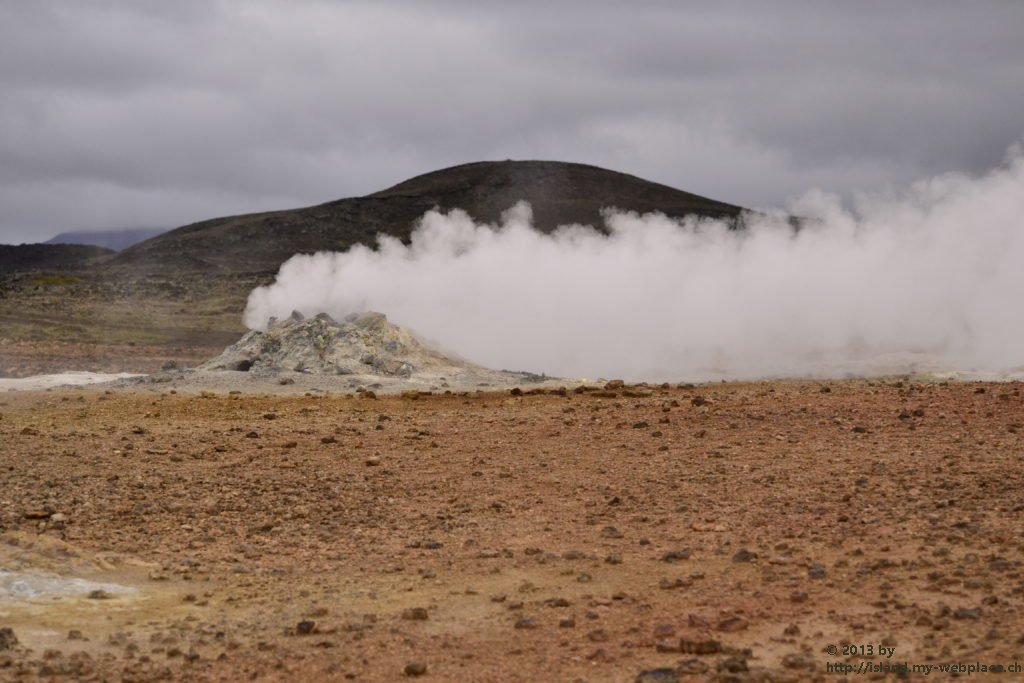 Wir verabschieden uns wieder von den Trollen und fahren die Strasse weiter bis zum wärmsten Gebiet von Island, dem Námafjall und Námaskard. Die Dampf- und Schlammquellen in diesem Hochtemperaturgebiet erreichen an der Erdoberfläche eine Temperatur von 80 bis 100 Grad. Kein Wunder, denn bei 1000m unter der Erde ist die Temperatur glatte 200 Grad. Mit dem Dampf steigen ebenfalls schwefel-wasserstoffhaltige Gase aus dem Erdinnern auf. In früheren Jahren waren daher hier Schwefelminen zu finden, aus dessen Ertrag man Schiesspulver herstellen konnte. Der Geruch an diesem Ort lässt schon von weit her erahnen worum es sich bei diesen dampfenden Quellen handelt.
