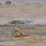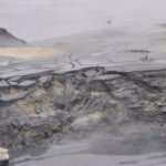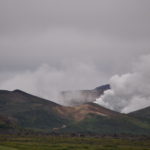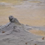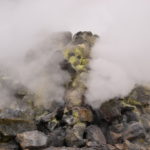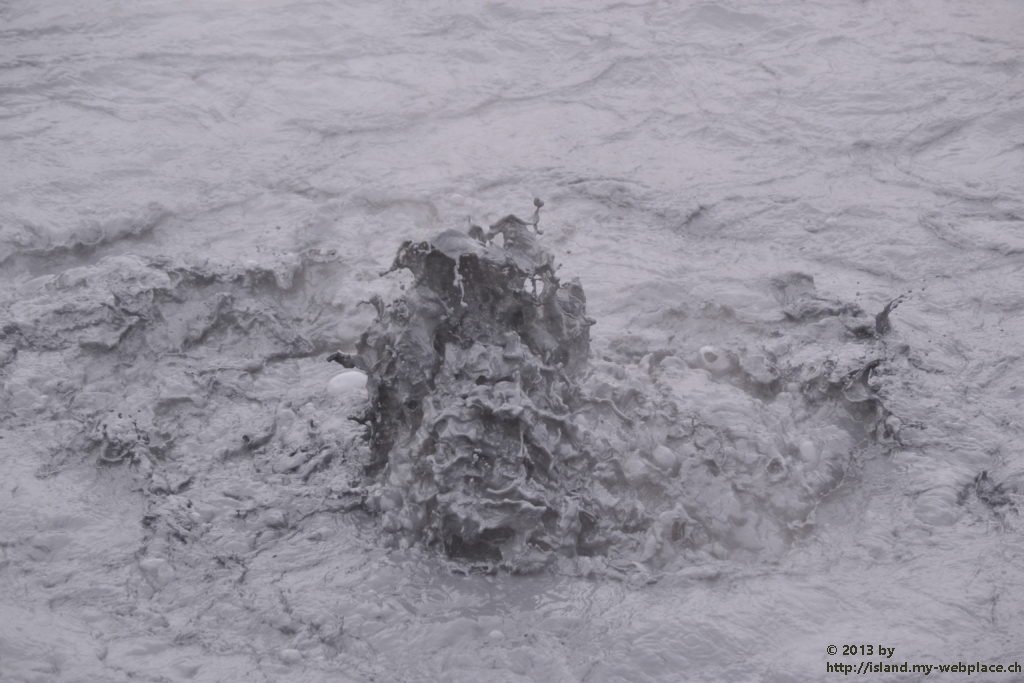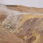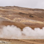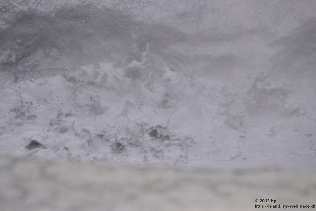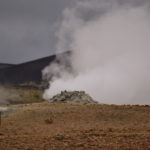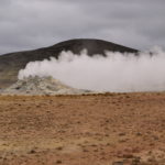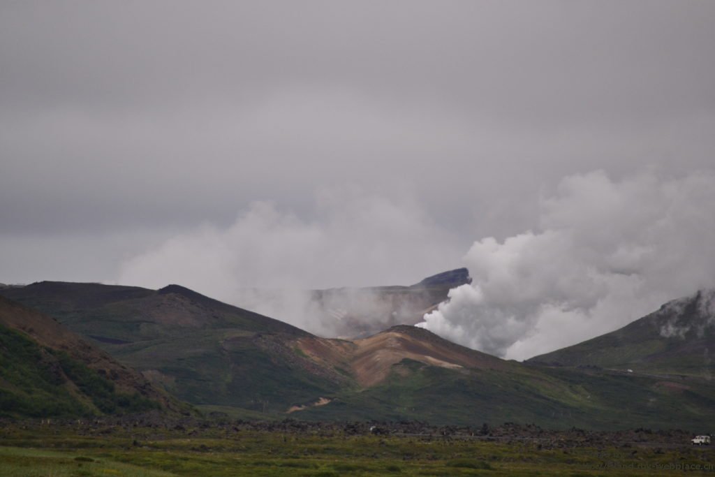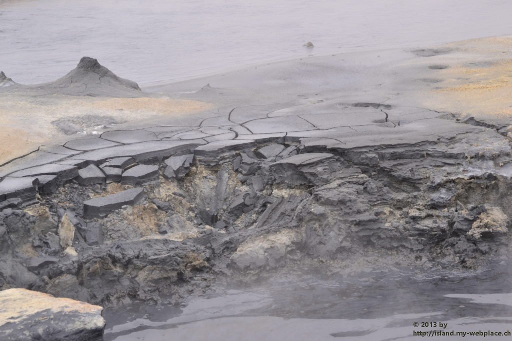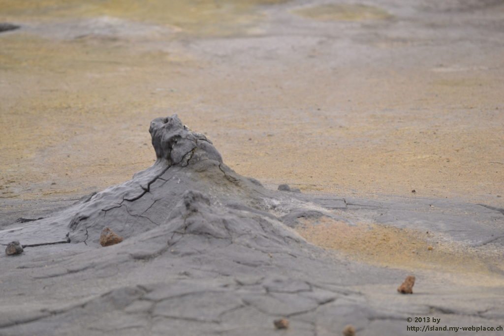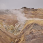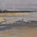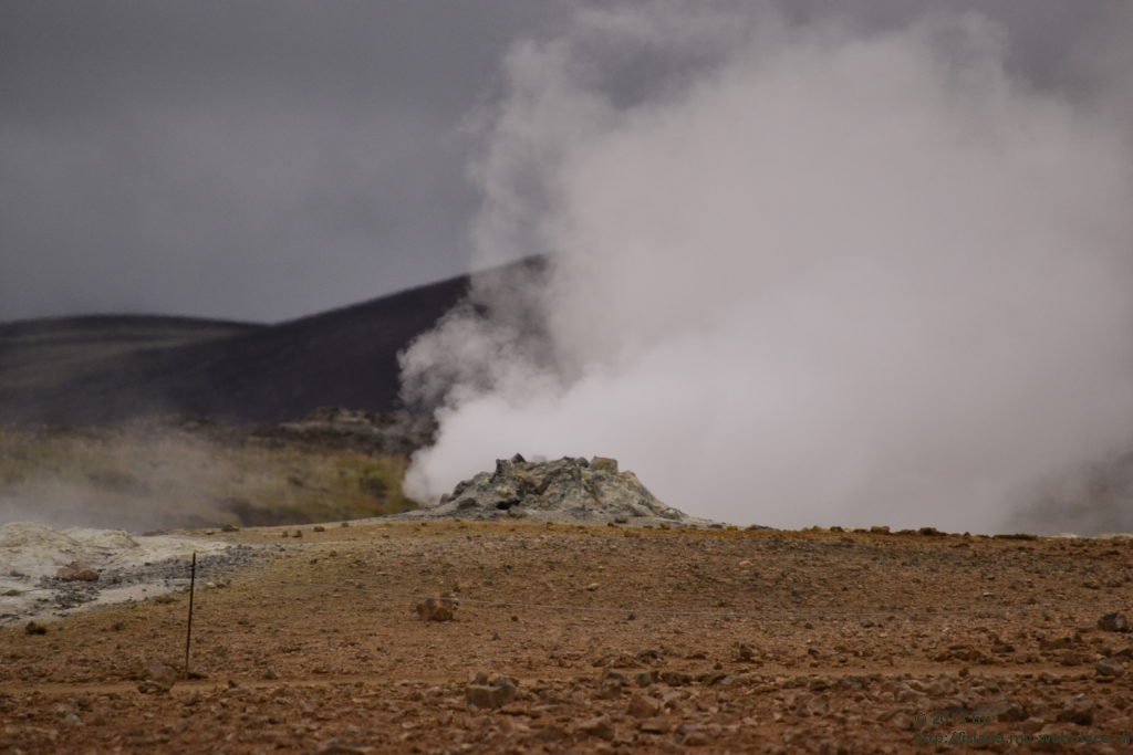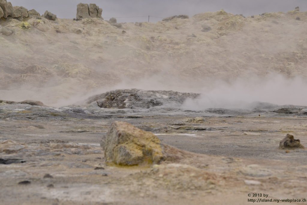 Wir verabschieden uns wieder von den Trollen und fahren die Strasse weiter bis zum wärmsten Gebiet von Island, dem Námafjall und Námaskard. Die Dampf- und Schlammquellen in diesem Hochtemperaturgebiet erreichen an der Erdoberfläche eine Temperatur von 80 bis 100 Grad. Kein Wunder, denn bei 1000m unter der Erde ist die Temperatur glatte 200 Grad. Mit dem Dampf steigen ebenfalls schwefel-wasserstoffhaltige Gase aus dem Erdinnern auf. In früheren Jahren waren daher hier Schwefelminen zu finden, aus dessen Ertrag man Schiesspulver herstellen konnte. Der Geruch an diesem Ort lässt schon von weit her erahnen worum es sich bei diesen dampfenden Quellen handelt.